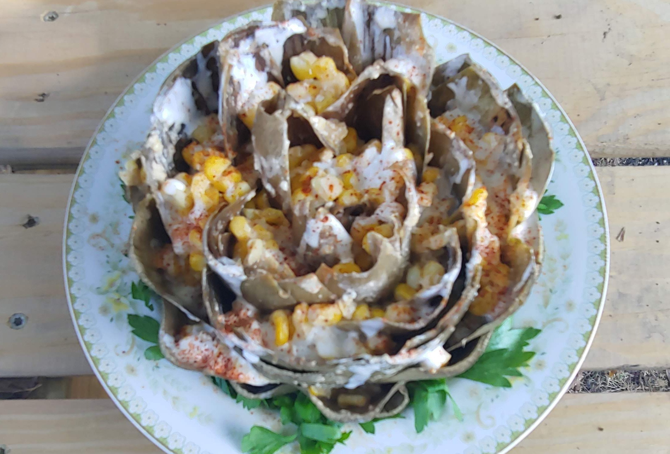 - Assemble! Place Artichoke right side up and slightly separate the leaves. Gently spoon in the elotes into each leaf pocket. Drizzle with creama and cotija cheese. Enjoy!